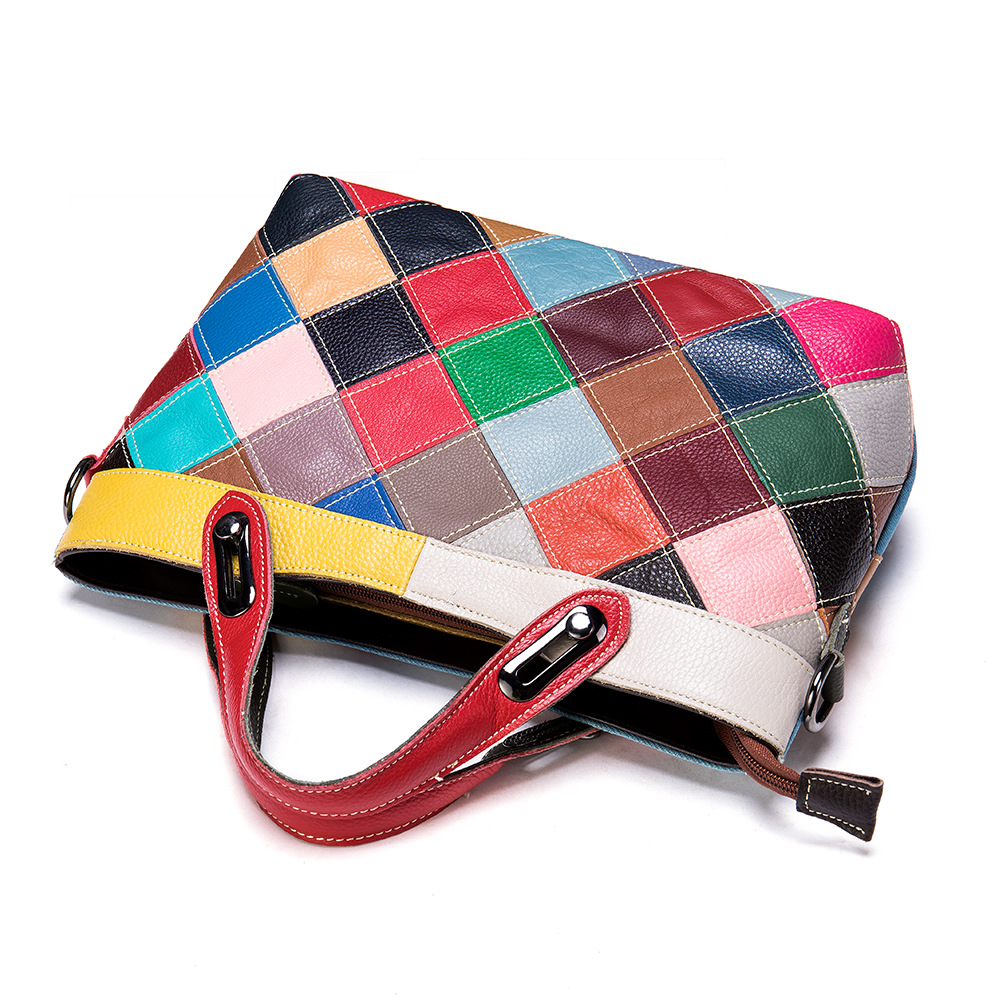 Elevate your style with our stunning new women's handbag, crafted from first layer cowhide for a luxurious feel. This chic bucket bag features a unique geometric pattern that is sure to turn heads. The stitching design adds a fashionable touch, making it the perfect accessory for any outfit. With a convenient zipper opening, you can easily access all your essentials while keeping them secure. The bag's soft surface not only looks elegant but also provides a comfortable grip, making it ideal for everyday use. Available in a vibrant chromatic color, this handbag is designed to stand out, ensuring you make a statement wherever you go. Its dimensions—210mm height, 290mm length, and 100mm width—make it the perfect size to carry your belongings without feeling bulky. Weighing just 0.66 kg, it's light enough to take with you anywhere. Don't miss out on this fashionable addition to your wardrobe!